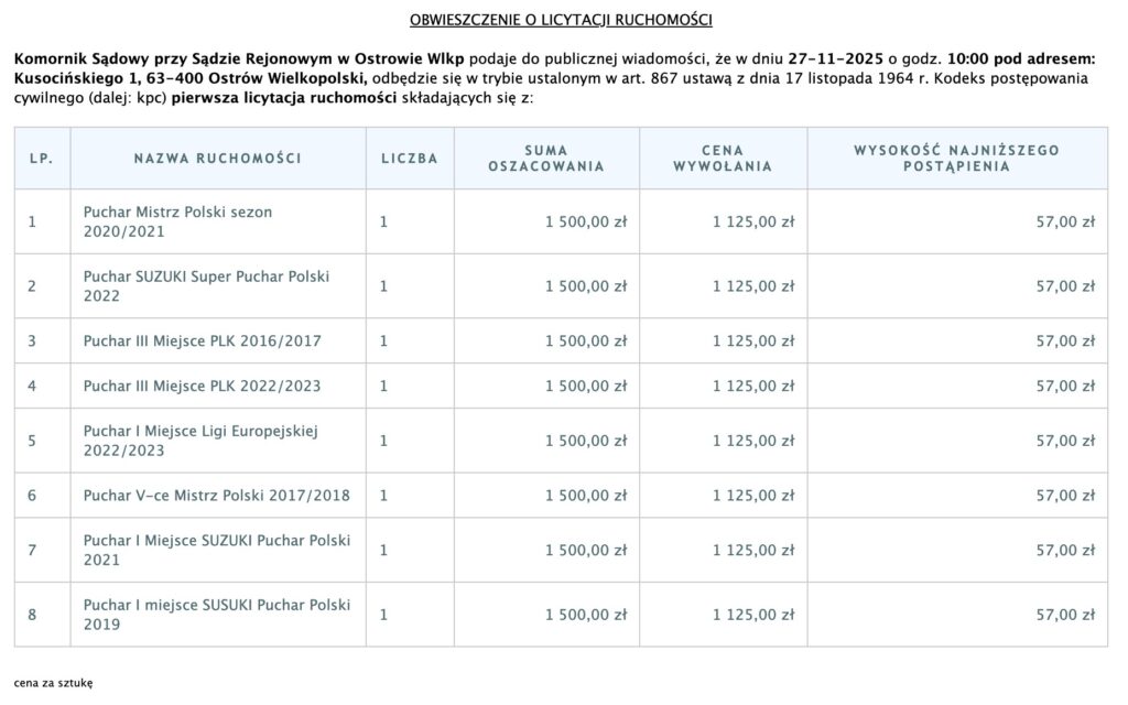 Licytacja została zaplanowana na 27 listopada. Czy nowa spółka spłaci cześć zobowiązań starej, by zachować najcenniejsze puchary?